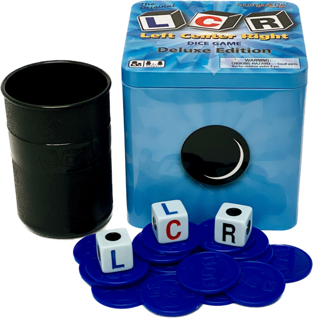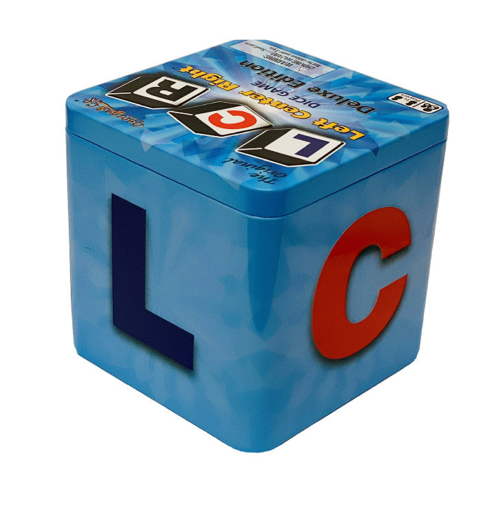 Our Deluxe Edition game includes three specialty marked deluxe sized LCR® Dice, 24 large playing chips, a dice cup, instructions and can easily be stored in the custom designed dice cube tin.
